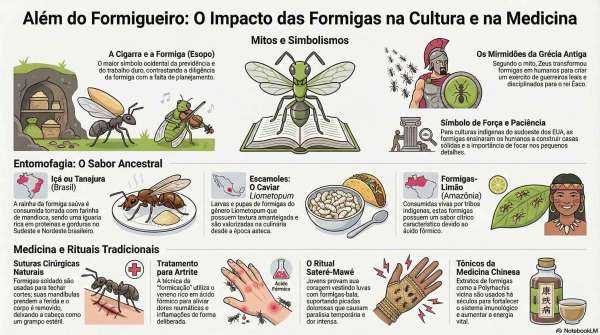 As formigas marcham não apenas através de florestas e cozinhas, mas também através de nossas histórias, mitos, arte e tradições. Sua presença onipresente na Terra garante que elas ocupem um espaço igualmente significativo na imaginação humana. Desde símbolos de virtude em fábulas antigas até ingredientes em banquetes e componentes em remédios tradicionais, as formigas deixaram uma marca indelével na cultura global. Para o mirmecologista amador, compreender essa dimensão cultural enriquece profundamente o hobby. A colônia no formigueiro deixa de ser apenas um objeto de observação biológica e se torna um elo vivo com uma longa e rica história de interação entre humanos e formigas, revelando que nossa fascinação por elas é, de fato, ancestral.