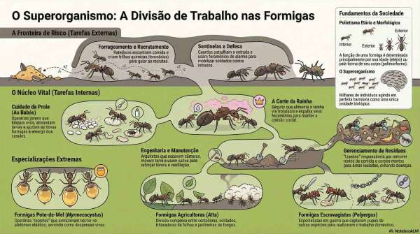 Imagine uma cidade que funciona em perfeita harmonia, sem a necessidade de chefes, dinheiro ou ordens diretas. Uma cidade onde cada cidadão nasce com uma aptidão inata para uma profissão e a executa com dedicação total ao longo de sua vida, tudo em prol do bem comum. Esta cidade é a colônia de formigas. O motor que impulsiona essa eficiência utópica é a especialização de funções, também conhecida na biologia como divisão de trabalho ou polietismo. Este princípio é, talvez, o elemento mais crucial para o sucesso das formigas como superorganismos. Ele permite que a colônia, como um todo, realize múltiplas tarefas complexas simultaneamente – cuidar dos mais jovens, construir e manter a casa, defender o território e buscar recursos – com uma coordenação que rivaliza com a de um organismo multicelular. Para o criador, observar essa orquestra de tarefas é testemunhar a inteligência coletiva em sua forma mais pura.