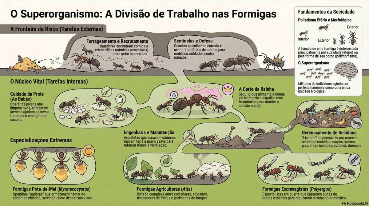 A especialização de funções em uma colônia é um sistema dinâmico, geralmente organizado com base na idade (polietismo etário) e, em muitas espécies, na morfologia (polimorfismo). Vamos detalhar as principais «profissões» dentro desta incrível sociedade.