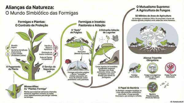 A imagem da formiga como uma guerreira implacável ou uma trabalhadora solitária conta apenas uma parte da história. Em sua jornada evolutiva, as formigas dominaram não apenas a arte do conflito, mas também a da cooperação, e não apenas entre si. Elas são mestras em formar alianças complexas e duradouras com outras espécies, um fenômeno biológico conhecido como simbiose. A simbiose é uma interação íntima entre dois organismos de espécies diferentes. Neste capítulo, focaremos no mutualismo, um tipo de simbiose onde ambos os parceiros se beneficiam da relação. Essas parcerias são tão sofisticadas e importantes que moldaram ecossistemas inteiros. Ao se associarem com plantas e outros insetos, as formigas assumiram os papéis de guarda-costas, pastoras e até mesmo de agricultoras avançadas, demonstrando uma capacidade de interagir com o mundo que vai muito além da simples caça e coleta.