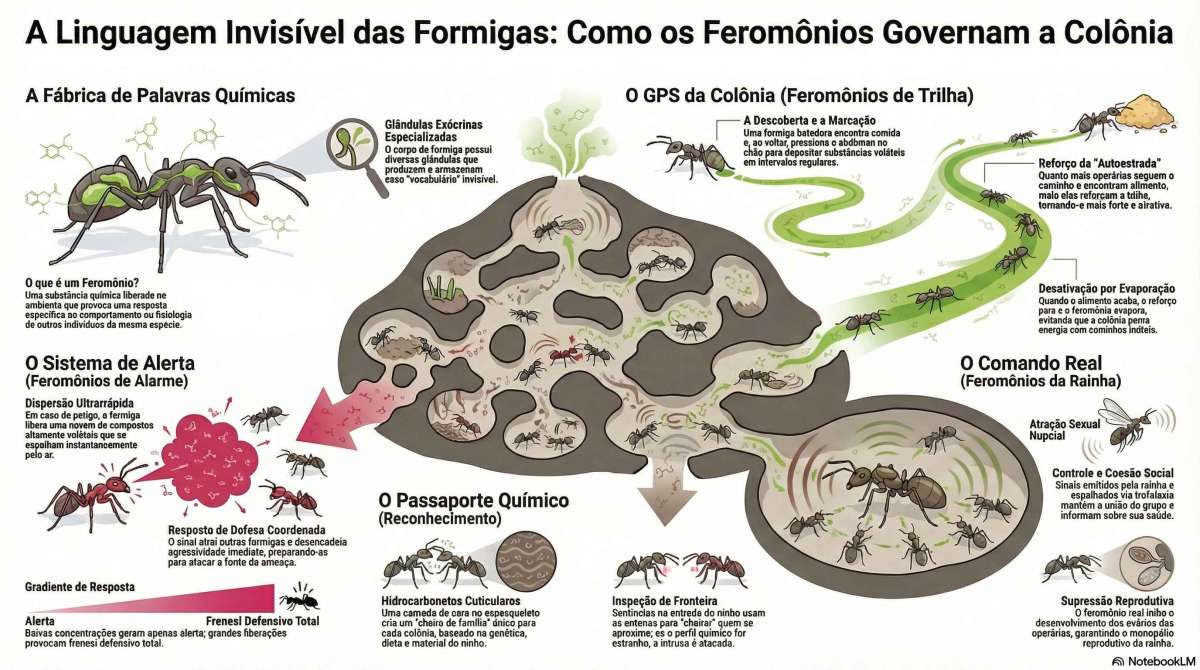 Imagine tentar coordenar o trabalho de milhares de indivíduos em um ambiente quase sempre escuro, labiríntico e silencioso. Como direcionar equipes de trabalho, soar um alarme em caso de perigo, reconhecer amigos e inimigos, ou mesmo organizar a distribuição de alimentos sem o uso da visão ou do som como ferramentas primárias? As formigas resolveram este desafio de comunicação de uma maneira incrivelmente sofisticada e eficiente: elas desenvolveram uma linguagem química. Elas vivem e operam em um mundo de cheiros e sabores, um universo sensorial que está em grande parte além da nossa percepção. A base dessa linguagem são os feromônios.